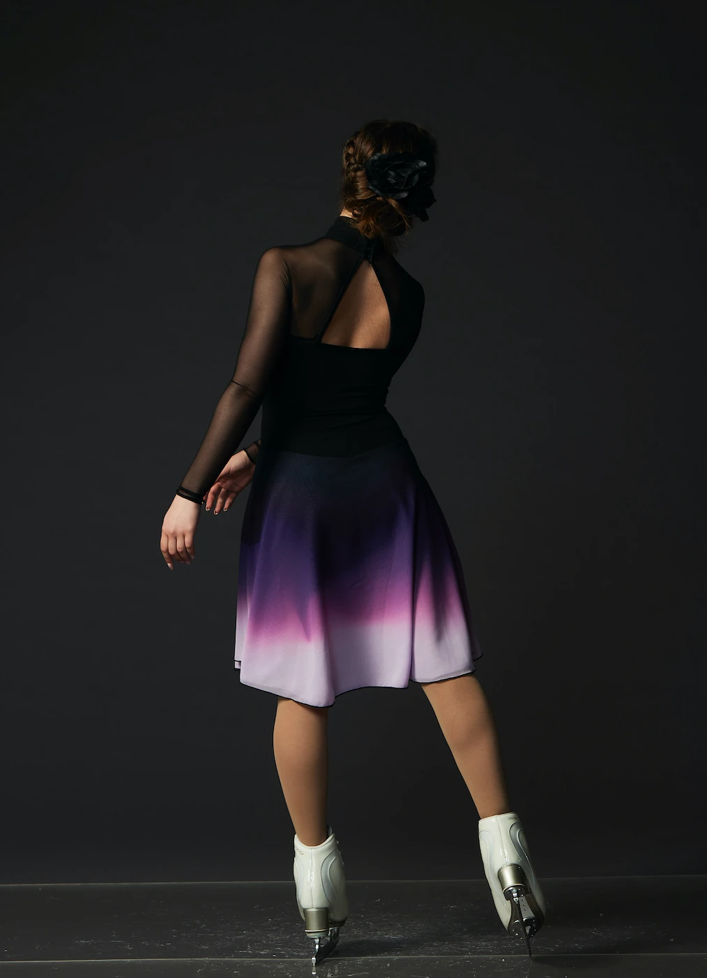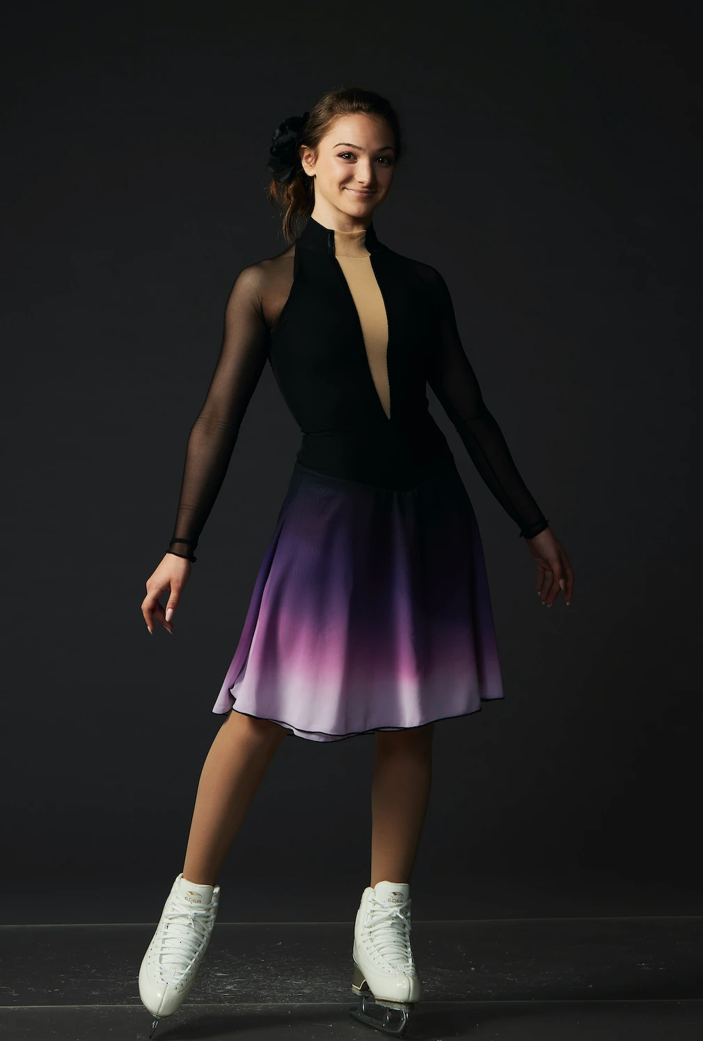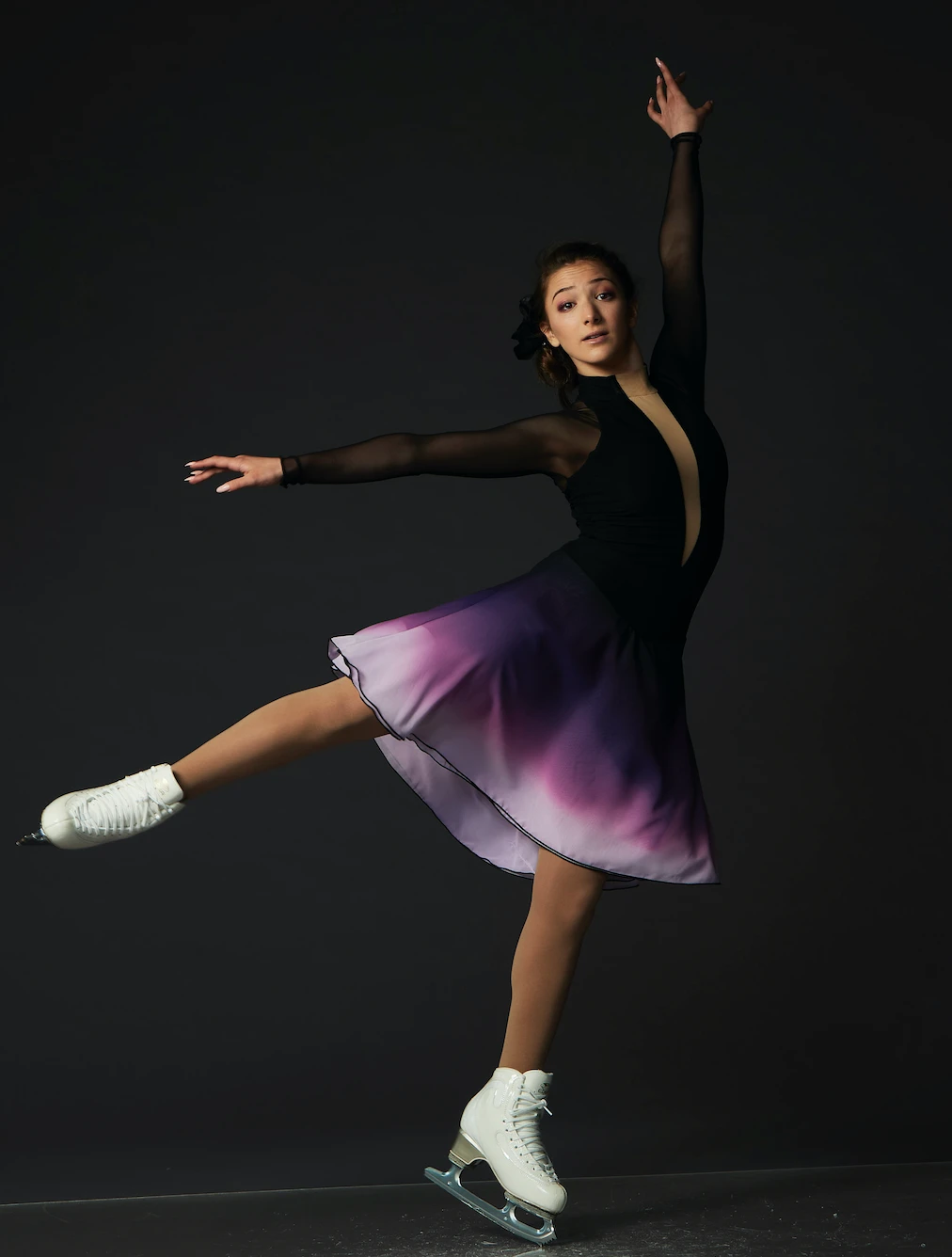 Classic sleeveless black dress with lace bodice, decorated with sparkly trimming and a long chiffon skirt for ice dance.