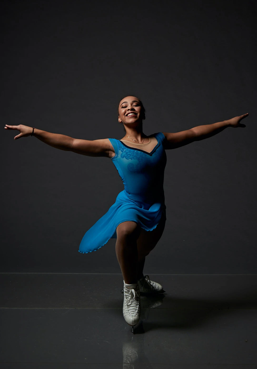 Classical teal dance dress with sublimated bodice and mesh with chiffon skirt.