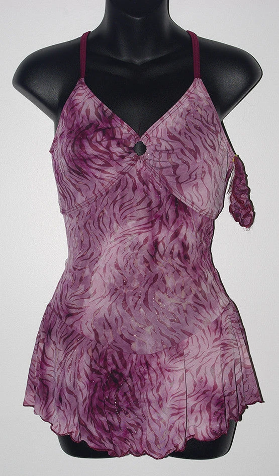 Pretty lycra dress with silver glitter swirls. Camisole style with straps attached to back ring. Front and back bodice liner. Matching hair scrunchie included.