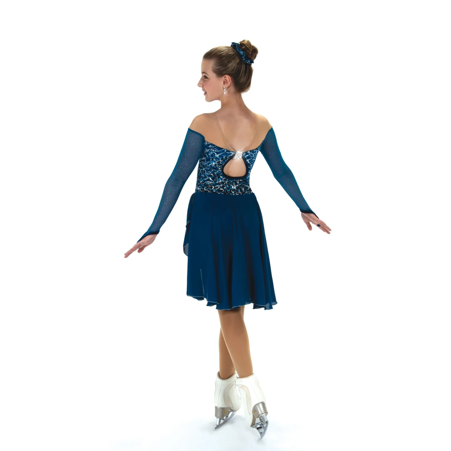 Flattering off-the-shoulder design with long shimmer mesh sleeves, a glittery velvet body and a dropped back keyhole with a crystal cluster accent. Matching georgette skirt is slanted and overlapped at one side.