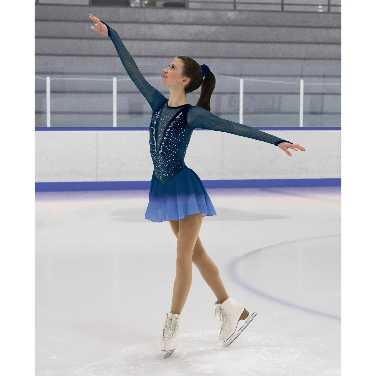 Deep jewel tone velvet dress with long mesh sleeves, a sparkling collection of clear and icy blue crystals outlining the V-shape design and a georgette skirt that dips into blue at the hem.