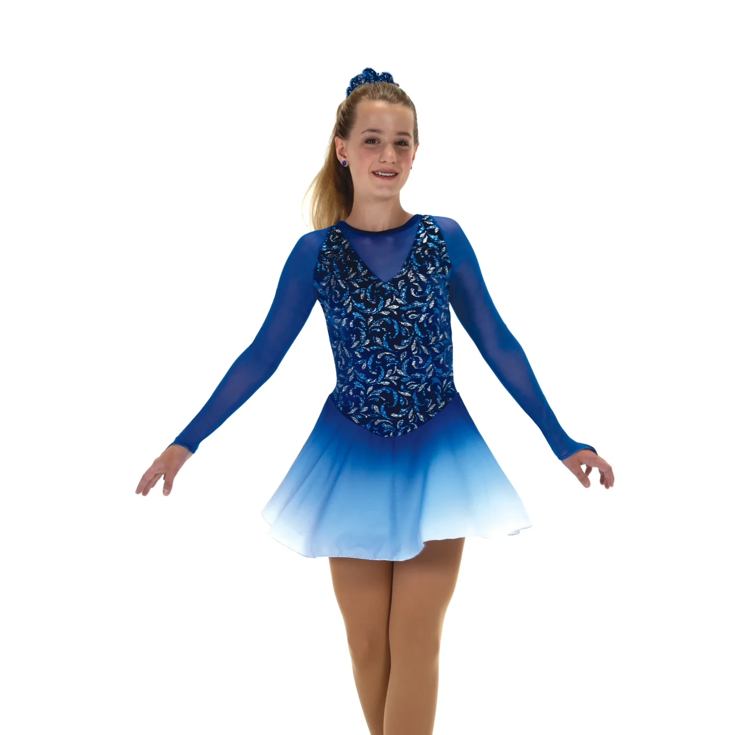 The lovely shade of royal in this velvet dress shades at the skirt to a soft misty blue at the hem that echoes the blue and silver glitter tones. Long mesh sleeves with finger points and a V-shape back with crystal accented straps add extra style.