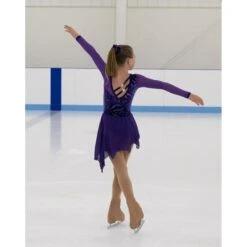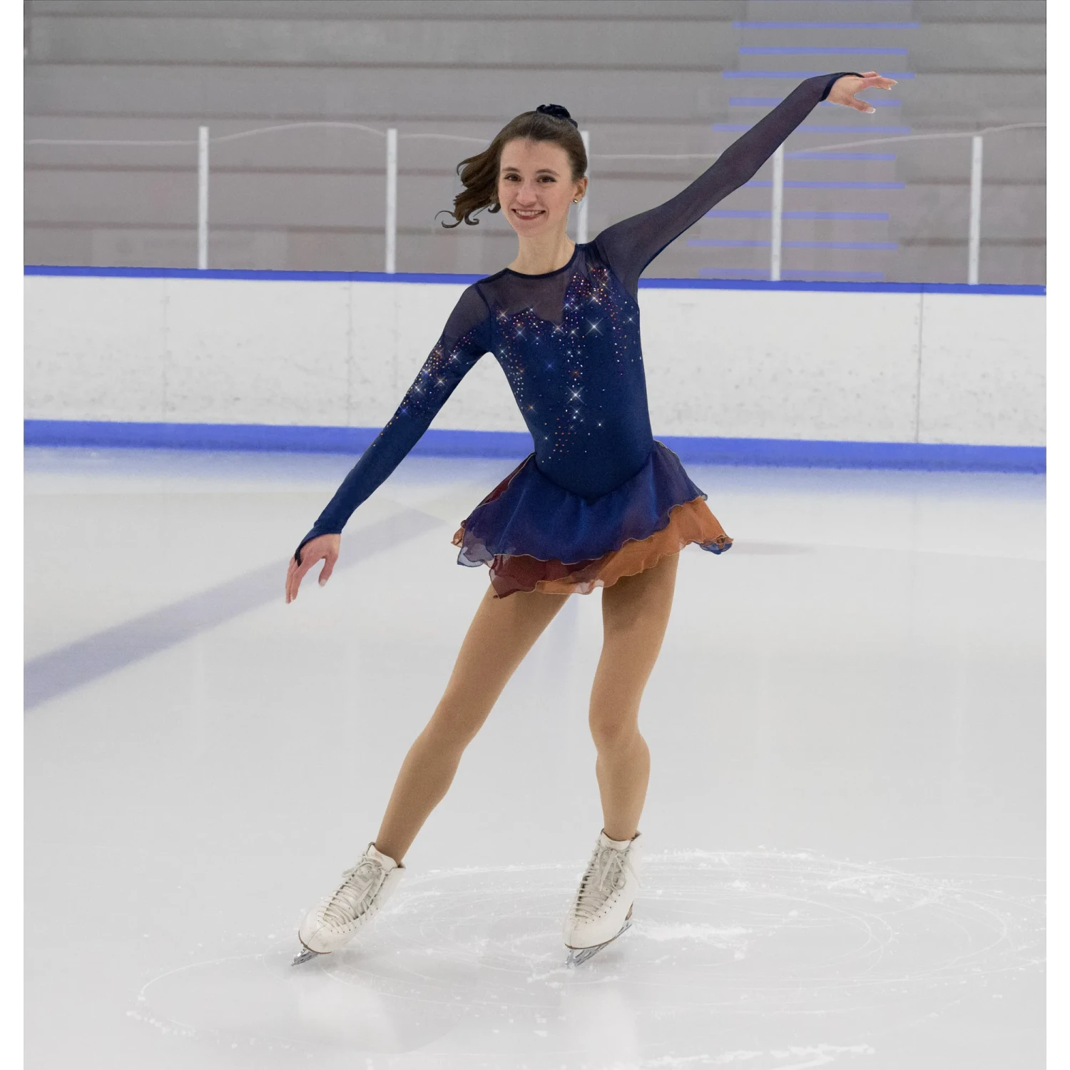 A sparkling combination of wine, copper and iridescent blue crystals look stunning against navy blue lycra. Shaped mesh accents, long sleeves with finger points and a layered linen chiffon skirt add classy details.