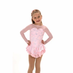 Swirls of white velvet flocking are sprinkled with silver glitter and set against sweet pastel colored lycra. Sweetheart shaping at the front features glitter mesh that extends down the long sleeves and accents the V-shape back. Double layer skirt and lycra panty. Lined.