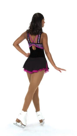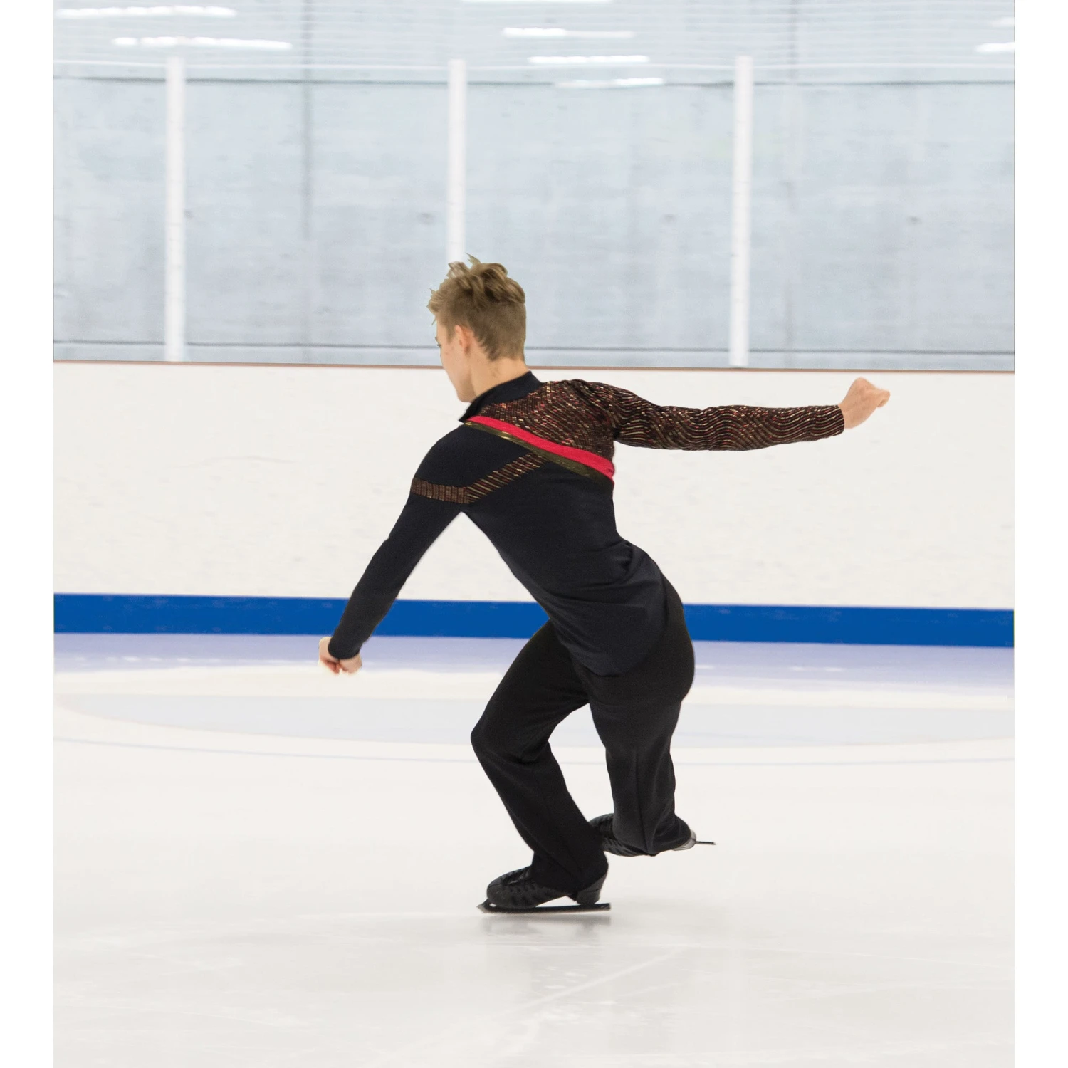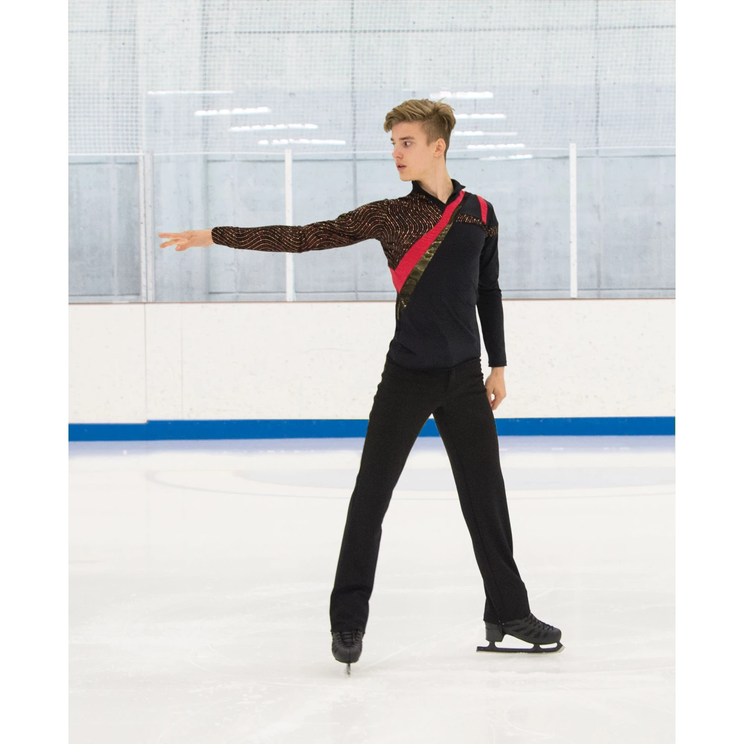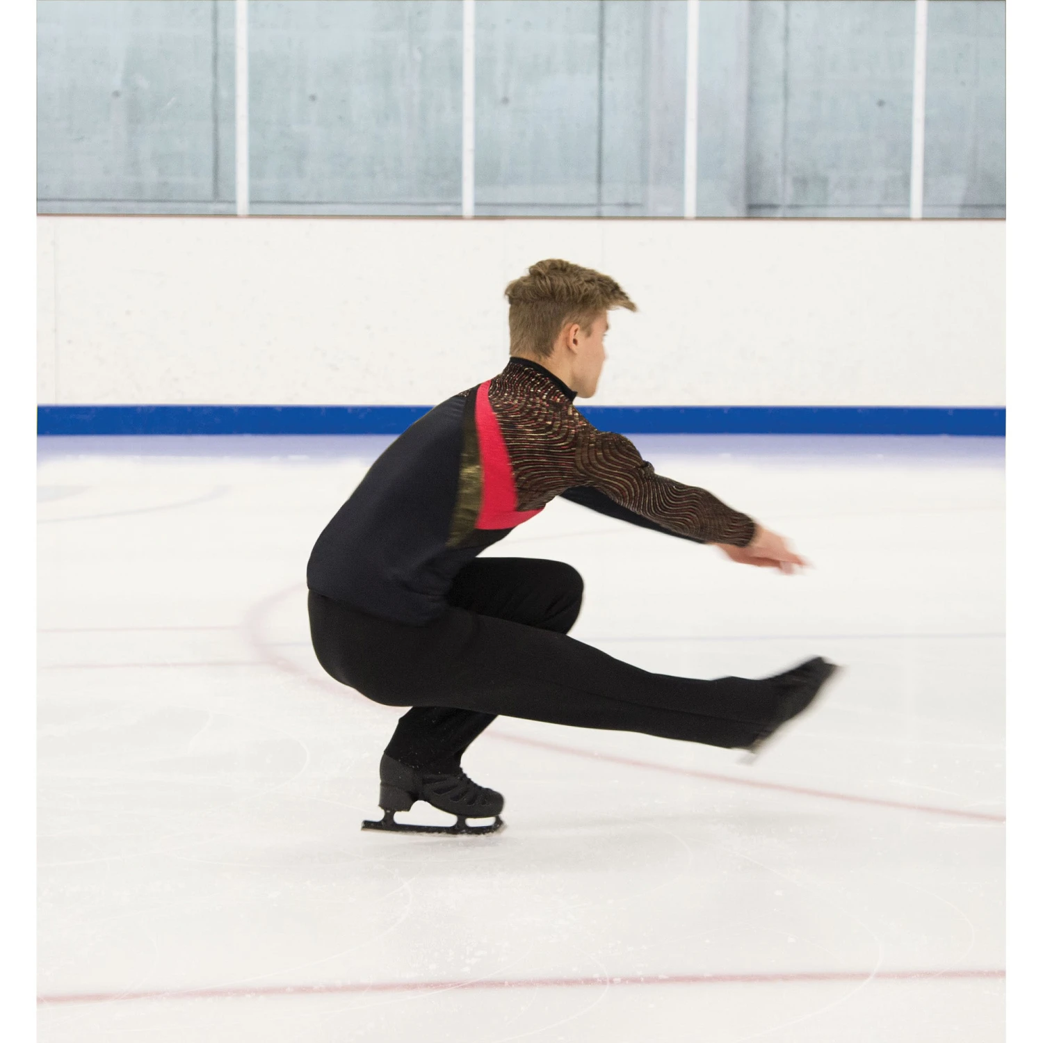 Long sleeved matte supplex shirt with collar and spliced accents of red and gold cut across the shoulders and sleeves.