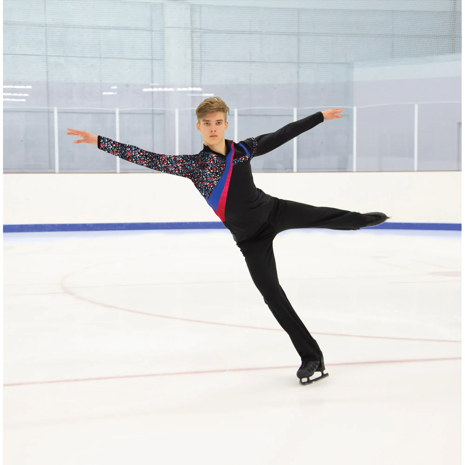 Diagonal stripes of colour and accents of red, silver and blue ice shards glitter make this black supplex shirt eye catching and bold. Long sleeves and an open shirt collar for a traditional look.