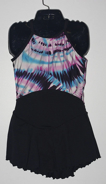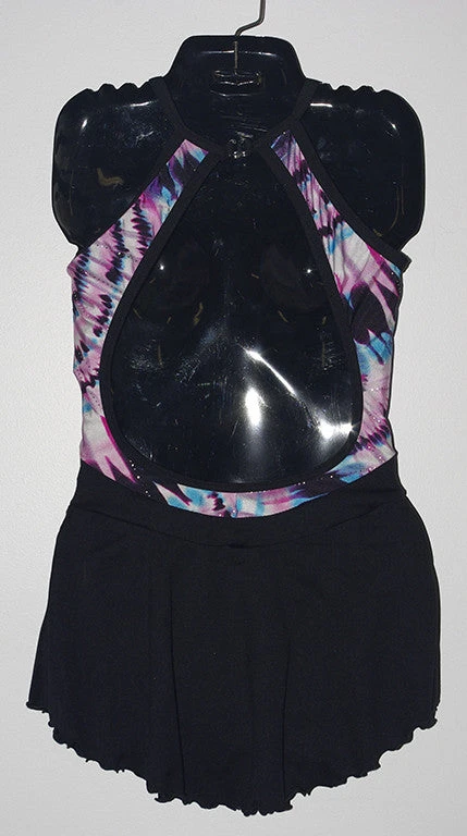 Halter style dress in Black lycra with large open back. Abstract print with silver sparkle bodice. Traditional lycra free skate skirt. Lined.