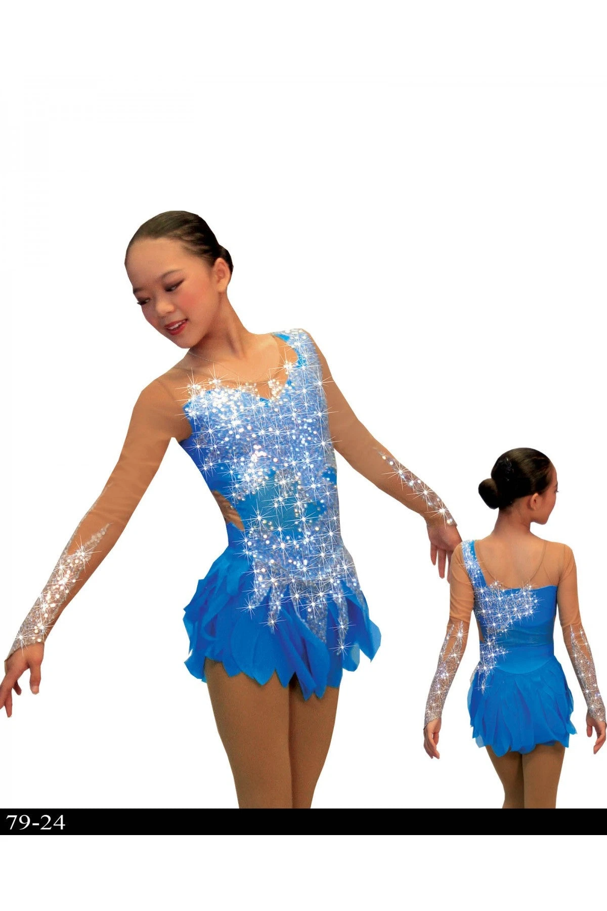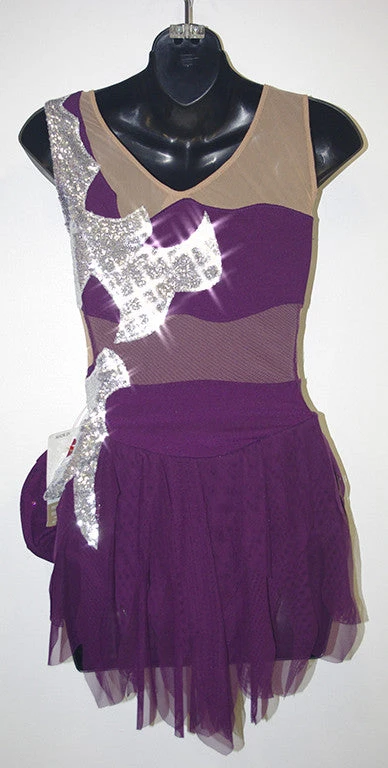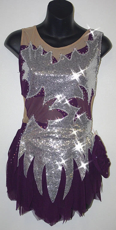 This free-form asymmetrical dress is made of colored mesh with a semi-sheer sequin fabric that has been applied in a flowing and beautiful design to the bodice and skirt.
