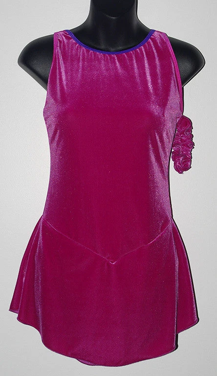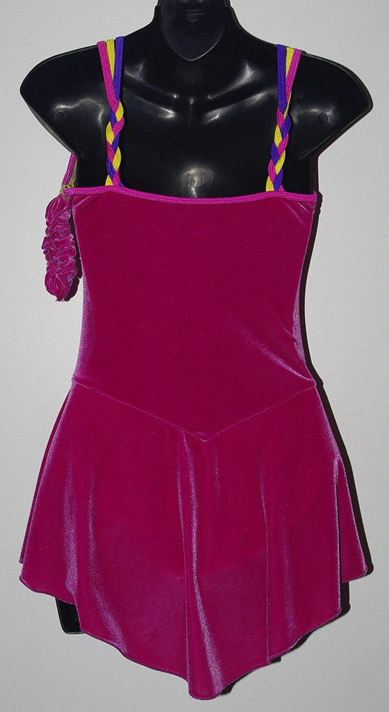 Pretty fuchsia velvet dress with braided multi-colored straps. Made long in the torso! Traditional velvet free skate skirt. Matching hair scrunchie.